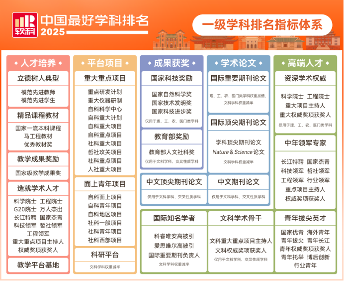 软科中国最好学科排名(一级学科)指标体系包括人才培养、平台项目、成果获奖、学术论文、高端人才5个指标类别,下设19个指标,共计200多项反映学科竞争力的观测变量。